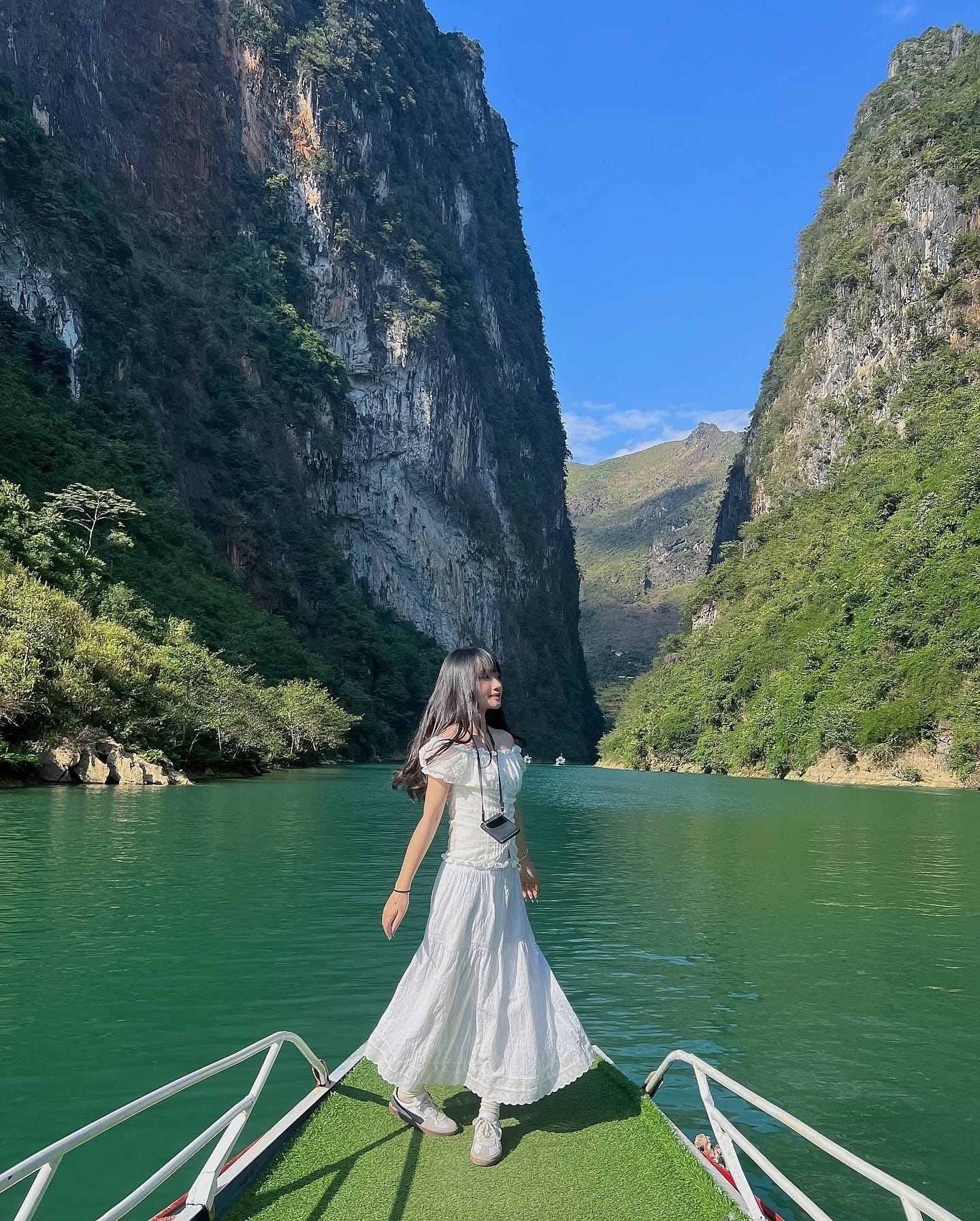 Du thuyền trên sông Nho Quế – Hẻm Tu Sản: Trải nghiệm ngồi thuyền trên dòng Nho Quế xanh ngọc bích, đi xuyên qua hẻm Tu Sản – hẻm vực sâu nhất Đông Nam Á. Cảnh sắc nơi đây hùng vĩ và tráng lệ, là điểm nhấn không thể thiếu trong hành trình du lịch Hà Giang bằng ô tô.